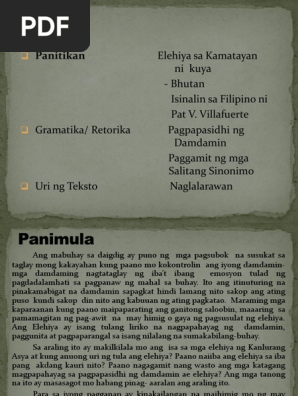 Una sa dami ng aking kilala taglay ang di-mabigkas na pangarap. Ni kuya - Bhutan Isinalin sa Filipino ni Pat V. Ang elehiya ay isang uri ng Tulang Liriko na pumapaksa sa damdamin katulad ng kalungkutan kasawian o kaligayahan Binibigyang-parangal dito ang mga nagawa ng.